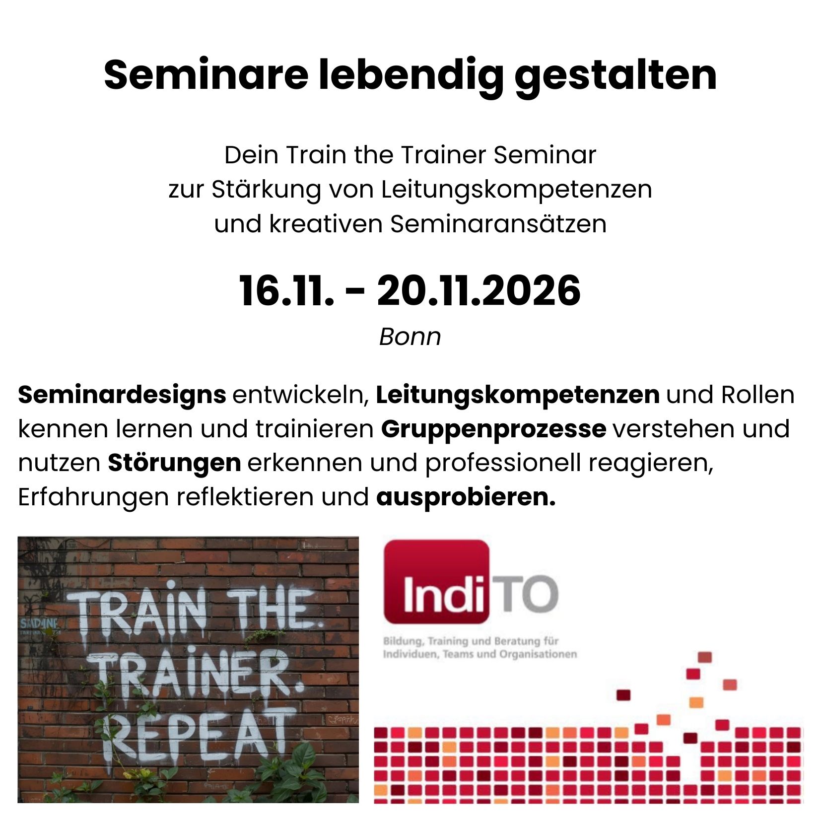 Dazu nehmen wir die wesentlichen Bestandteile von Seminaren, die unabhängig vom Thema immer dabei sind, in den Mittelpunkt: Leitung, Gruppe, Störungen und Seminargestaltung.